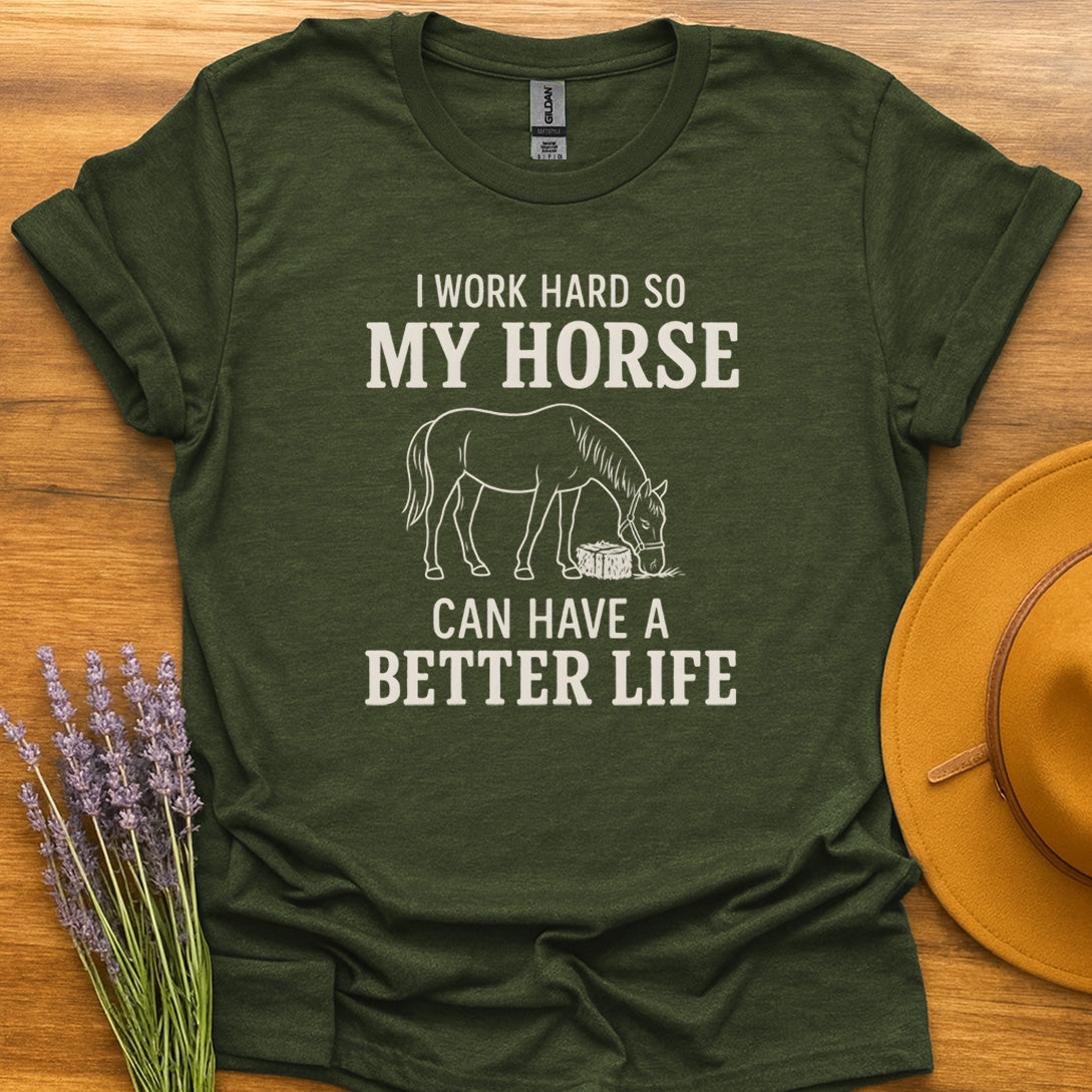 Imagine getting ready for a relaxed day at the stables, feeling the crisp morning air as you bond with your horse. With the “Better Life For My Horse” T-shirt, every moment becomes a celebration of your passion—a stylish statement that fits right into the heart of every equestrian’s lifestyle. Whether you’re heading out for a ride or enjoying a laid-back afternoon with friends, this tee brings out your love for horses in the most comfortable way.