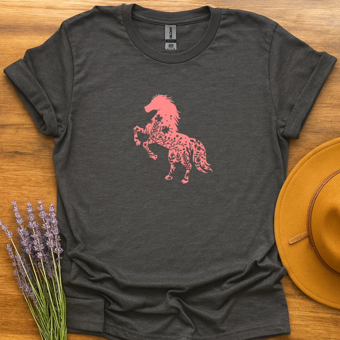 Perfect for weekend adventures, casual office days, or relaxed social outings, the Floral Horse Silhouette t-shirt adapts to your busy lifestyle. Its breathable fabric keeps you comfortable during outdoor activities, while the unique design elevates your everyday wardrobe. Whether paired with sneakers or sandals, this t-shirt effortlessly enhances your look with a touch of charm and sophistication.