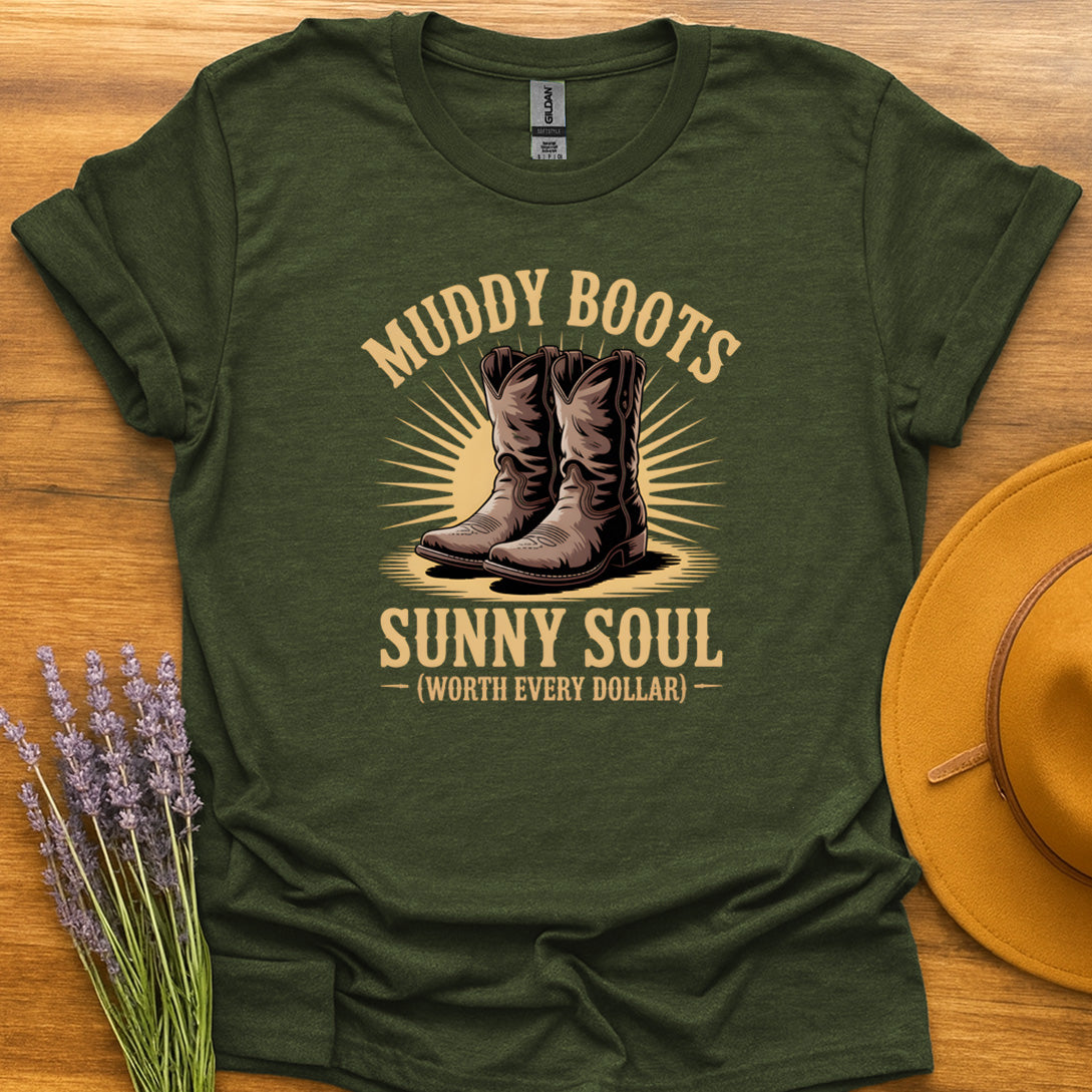 The Muddy Boots Sunny Soul t-shirt enhances your lifestyle by offering superior comfort and adaptable style. Perfect for casual outings, outdoor adventures, or simply relaxing, this tee keeps pace with your busy, vibrant life while staying effortlessly stylish.