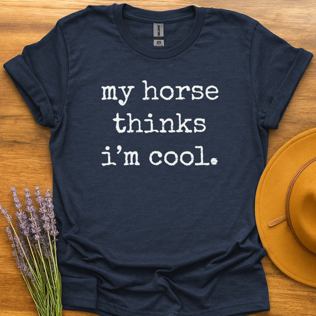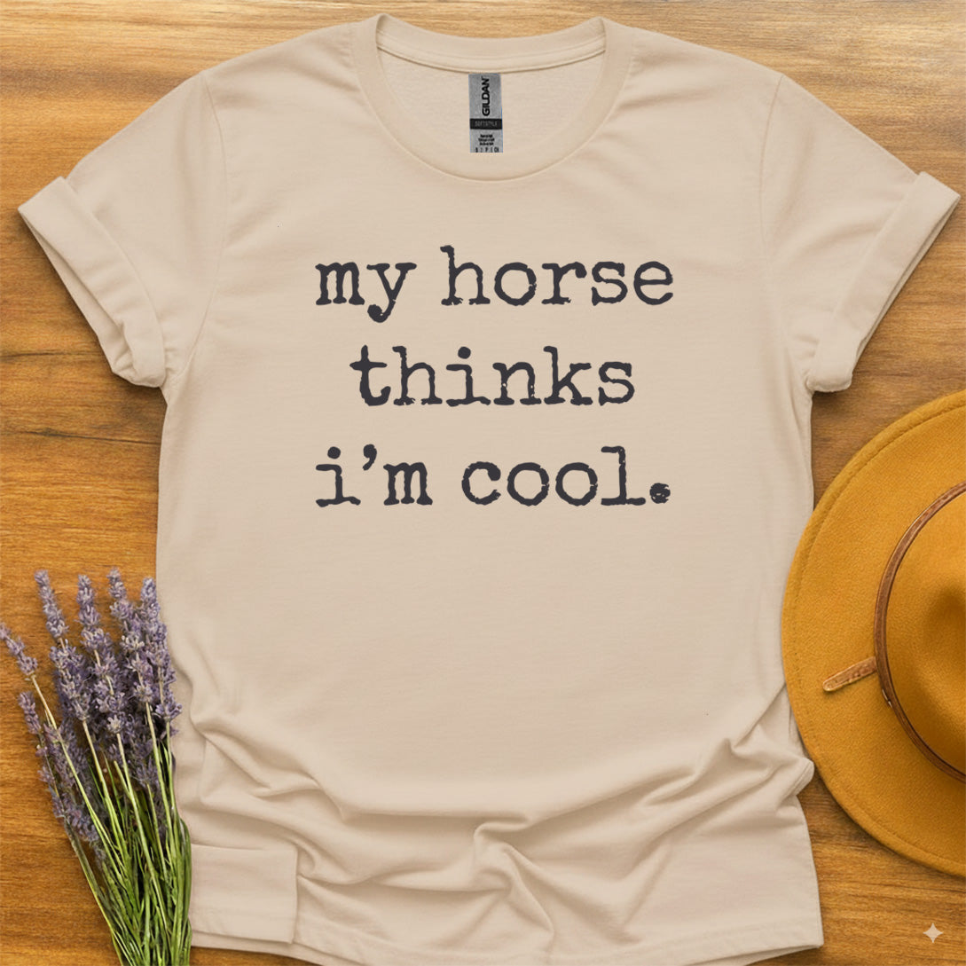 Imagine yourself heading out to the stables on a crisp morning, the sun rising as you prepare for a relaxing ride. Your "My Horse Thinks I'm Cool" t-shirt perfectly matches your passion and sense of humor, making you smile before you even saddle up. It reflects not just your love for riding but the special bond you share with your horse, adding a touch of personality to your equestrian lifestyle.