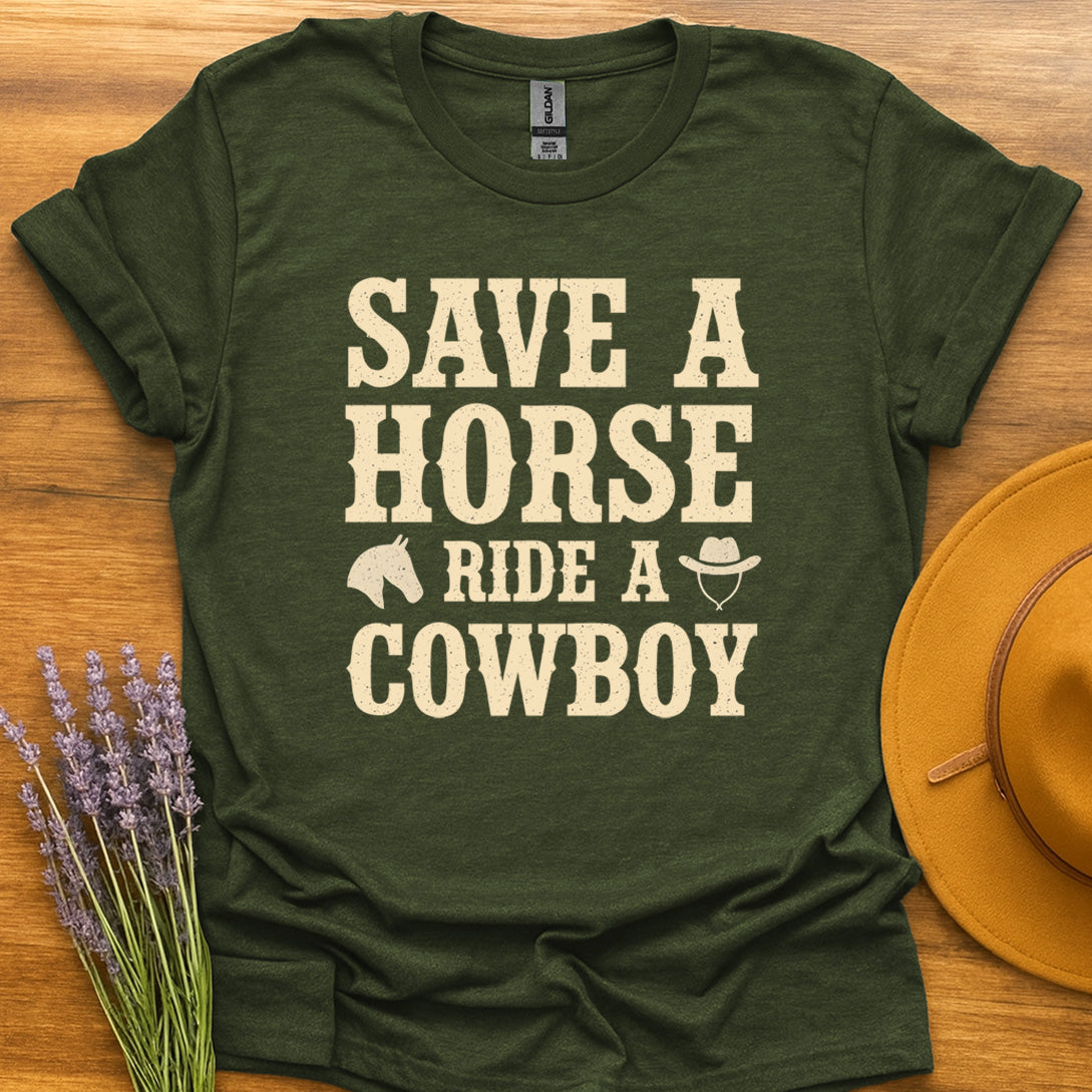Add a little mischief to your wardrobe and let your personality shine with this standout t-shirt. Whether you're headed to a casual get-together, a music festival, or just relaxing at home, the "Save a Horse Ride a Cowboy" t-shirt is ready for wherever your American journey takes you.